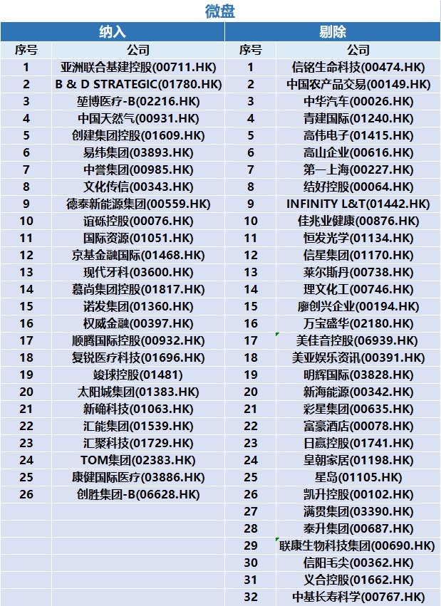 此外,微盘股此次纳入26只港股,包括亚洲联合基建控股(00711)等;剔除信铭生命科技(00474)等32只港股。