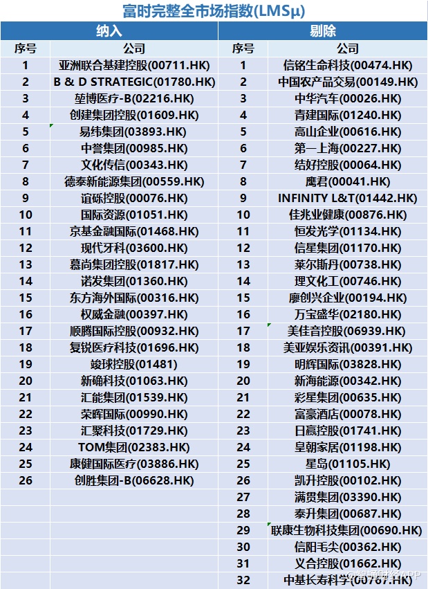 富时完整全市场指数(LMSμ)此次纳入亚洲联合基建控股(00711)等26只港股,剔除信铭生命科技(00474)等32只港股。