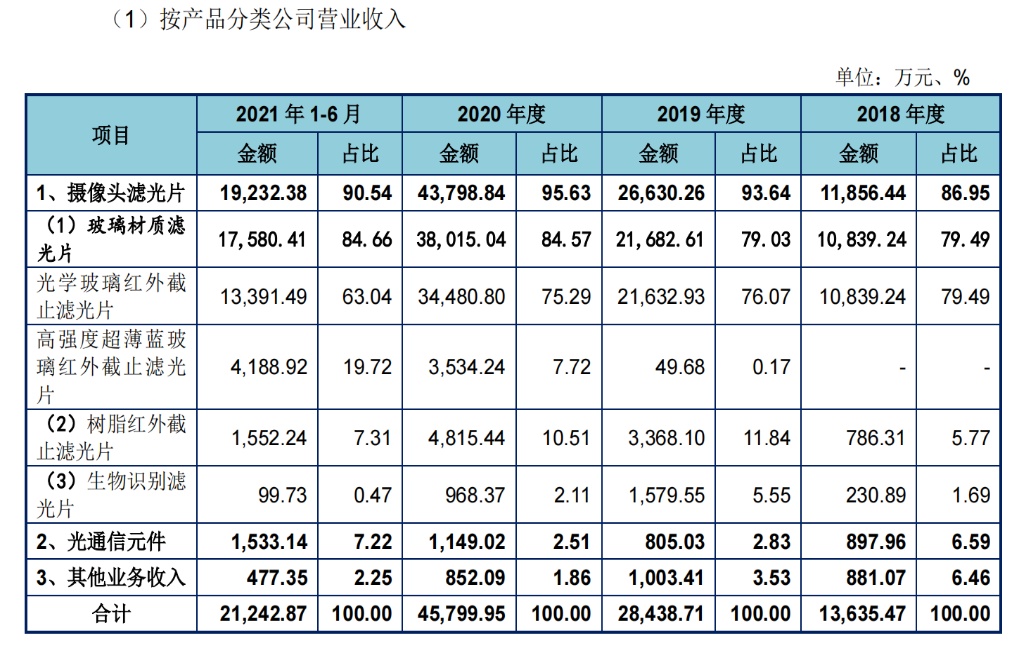据东田微招股书,公司是一家专业从事精密光电薄膜元件研发、生产和销售的高新技术企业,并具备镀膜材料自研和生产能力,主要产品为摄像头滤光片和光通信元件等,可广泛地应用于消费类电子产品、车载摄像头、安防监控设备以及光通信信号传输、数据中心等多个应用终端领域中。
