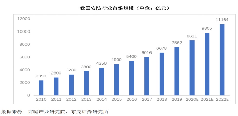 此外,安防行业也是拉动摄像头需求的“重镇”。行业数据显示,安防行业市场规模由2011年的2800亿元增长至2019年的7562亿元,年均复合增长率高达13.87%。安防产业“十三五规划”在产业发展目标中指出,到2020年我国安防企业总收入约达8000亿元,年增长率达10%左右。