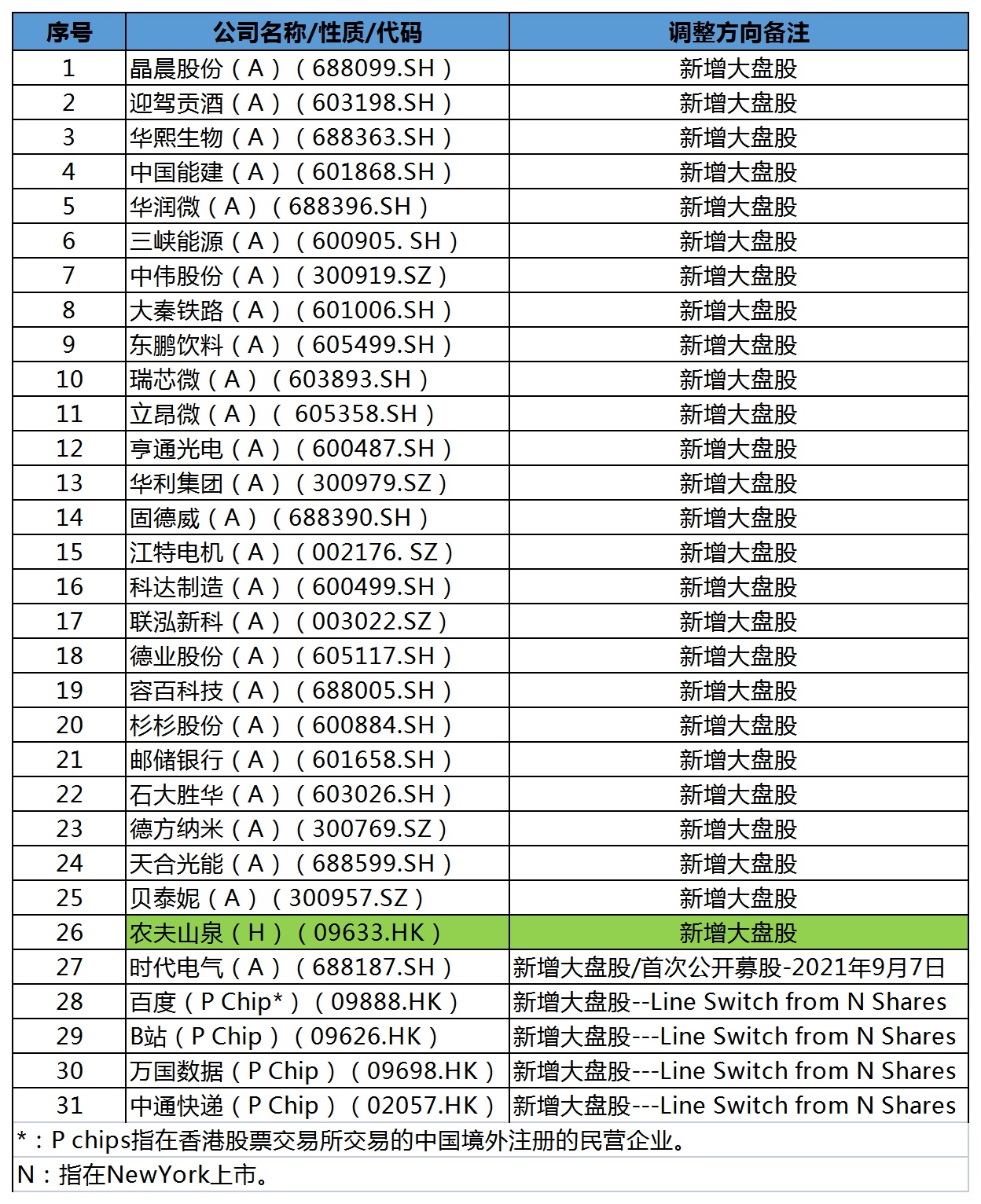 新增大盘股27只,除了港股农夫山泉之外,还包括26只A股,分别是:晶晨股份、迎驾贡酒、华熙生物、中国能建、华润微、三峡能源、中伟股份、大秦铁路、东鹏饮料、瑞芯微、立昂微、亨通光电、华利集团、固德威、江特电机、科达制造、联泓新科、德业股份、容百科技、杉杉股份、邮储银行、石大胜华、德方纳米、天合光能、贝泰妮、时代电气。