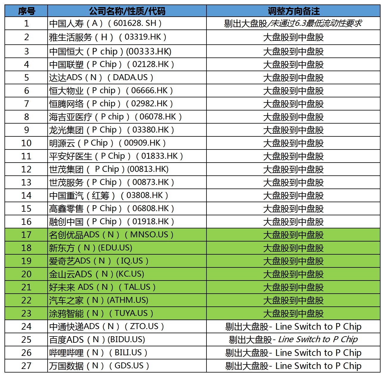 中国人寿A股被剔出大盘股,雅生活服务等15只港股以及名创优品等7只美股中概股由大盘股调整只中盘股。 中通快递、百度、哔哩哔哩、万国数据仍然在大盘股中,只是纳入的对象从美股调整为港股。