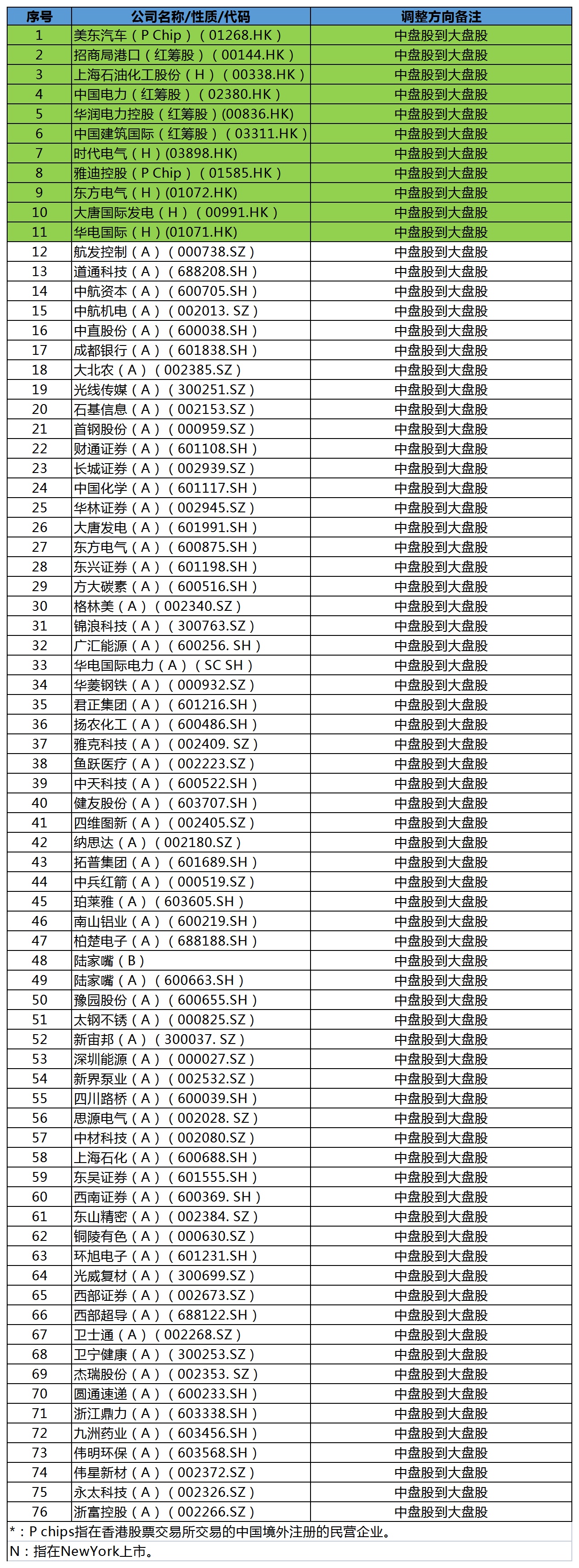 由中盘股调至大盘股的一共76只,其中包括美东汽车、招商局港口、上海石油化工股份、中国电力、华润电力控股、中国建筑国际、时代电气、雅迪控股等11只港股,航发控制、道通科技、中航资本等65只A股(B股)。
