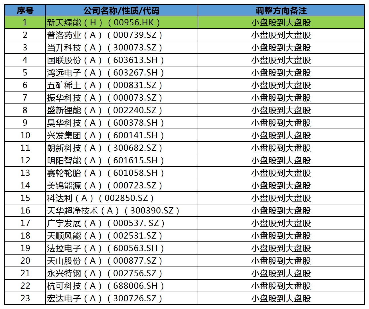 由小盘股调整至大盘股的一共23只,其中包括港股新天绿能(00956.HK),A股普洛药业、当升科技、国联股份等。