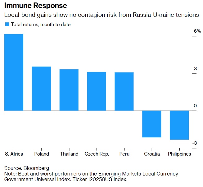 尽管俄乌紧张局势不断升级,但伴随着投资者转而密切关注主要央行推动全球紧缩周期的影响,新兴市场继续维持坚挺。