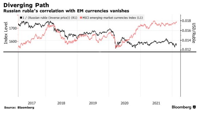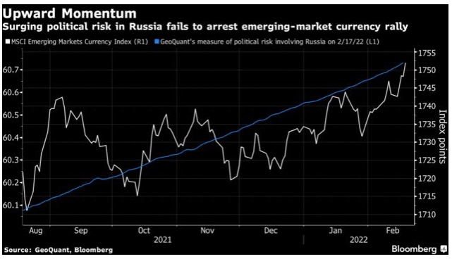 根据研究公司GeoQuant的分析,自11月7日以来,俄罗斯的政治风险与日俱增。但与此同时,新兴市场货币也出现了反弹,其基准指数升至八个月来的最高水平,这表明,交易员对连续加息的情绪可能超过了对地缘政治紧张局势的担忧。