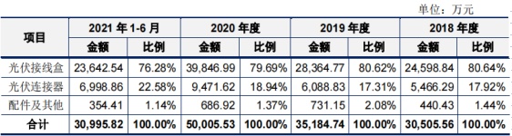 拆分收入结构来看,快可电子主营业务突出,主营业务的收入占比常年保持在98%以上。进一步细分,公司的主营业务主要包括光伏接线盒、光伏连接器、配件及其他三个项目。