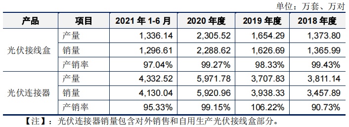 报告期内,公司的光伏接线盒和光伏连接器产销量均呈现大幅抬升趋势,其中光伏接线盒的产量分别为1373.8万套、1654.29万套、2305.52万套、1336.14万套,销量为1365.99万套、1626.69万套、2288.62万套、1296.61万套,产销量维持在高位。