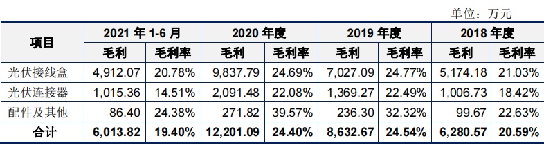 期内,光伏接线盒始终为公司的第一大收入来源,收入由2018年的2.46亿元上升到2020年的3.98亿元,占比徘徊在80%上下;同期,光伏连接器实现收入5466.29万元、6088.83万元、9471.62万元,占比约为20%。