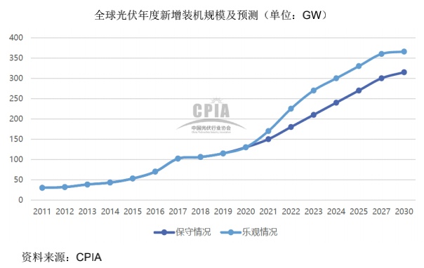 就目前光伏行业的发展而言,作为备受瞩目的明星赛道,市场对于其未来几年的增速仍颇为乐观。根据中国光伏行业协会数据,2020年全球光伏新增装机预计可达130GW,创历史新高;在多国“碳中和”目标、清洁能源转型及绿色复苏的推动下,预计“十四五”期间全球每年新增光伏装机约210-260GW。