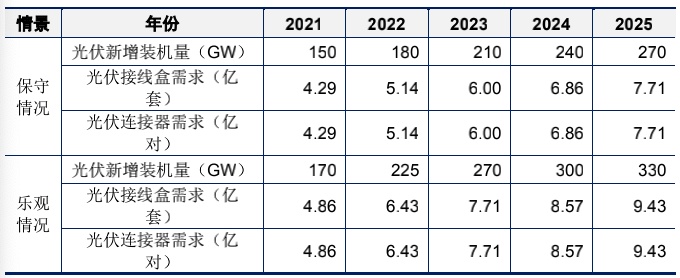具体到光伏接线盒和光伏连接器,根据CPIA对全球光伏新增装机量的预测,未来几年全球光伏接线盒和连接器的需求在乐观情况下预计至2025年将较2021年有大幅增长,其中后者的需求量更有望接近翻倍。