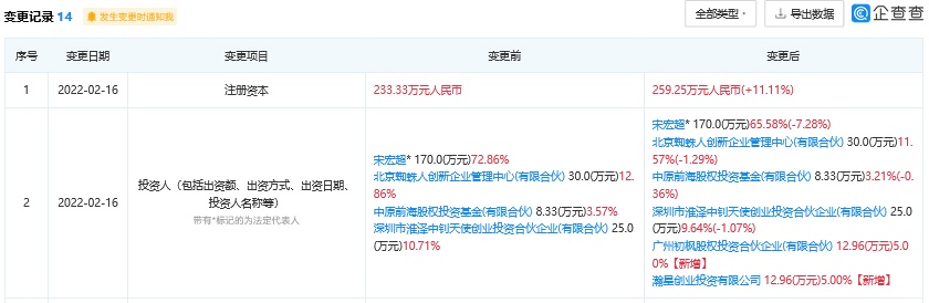 智通财经APP获悉,据企查查APP显示,深圳市蜘蛛人智能科技有限公司日前发生工商变更,新增股东瀚星创业投资有限公司,持股约5%;新增股东广州初枫股权投资合伙企业(有限合伙),持股约5%。