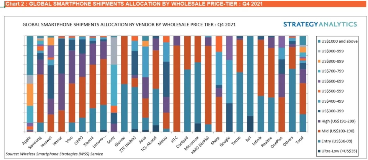智通财经APP获悉,据Strategy Analytics数据,2021年Q4,全球智能手机行业批发收益和平均售价分别同比增长6%和9%,2021年全年也分别同比增长15%和10%。苹果(APPL.US)保持了领先地位,并获得了收益份额。三星紧随其后,收入份额较去年有所提高。在收益方面,小米(01810)保持第三位,其次是OPPO和vivo。荣耀超过了realme,升至第6位,紧随其后的是realme、联想-摩托罗拉、华为和传音。