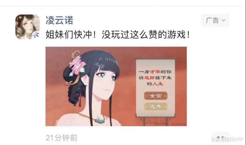 在内容运营方面,作为新一代女性向国风社交手游的典范,《凌云诺》在产品的核心内容上主打“国风+社交”。因此,为契合游戏的精准化市场推广,友谊时光选取了市场上具有较强社交属性的平台,例如微信朋友圈和抖音开屏进行内容投放。