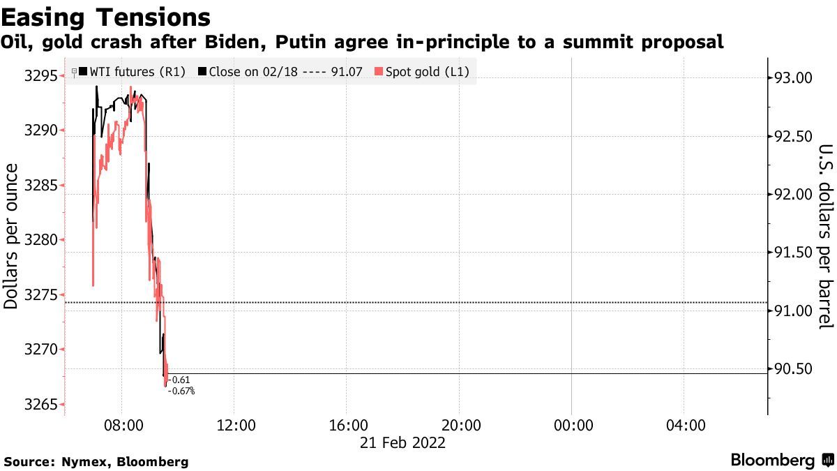ING Groep NV大宗商品策略主管Warren Patterson表示:“原油市场继续受到俄罗斯-乌克兰事态发展的影响。”他补充称:“避险需求推动了金价,而拟议的峰会确实让市场紧张情绪松了一口气,因为这表明双方仍有可能进行对话。但资产价格,尤其是大宗商品价格,将继续受到俄乌冲突的严重影响。”