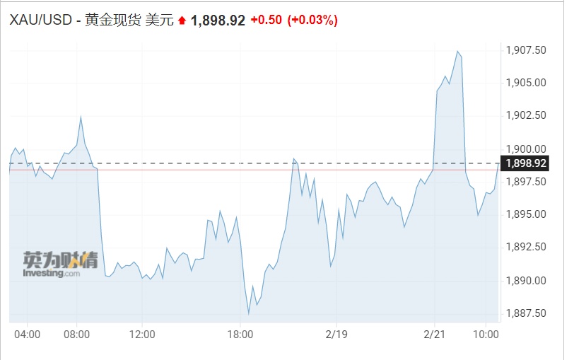现货黄金小幅上扬0.03%,至每盎司1,898.92美元,今日早些时候曾触及6月3日以来的盘中最高水平。