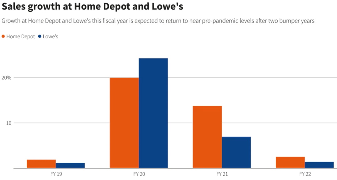得益于疫情驱动的工具、油漆和园艺设备,来自居家的美国人的需求,这两家公司经历了两年的强劲销售增长,但随后这两家公司将预计今年全年销售增长将接近疫情前的水平。