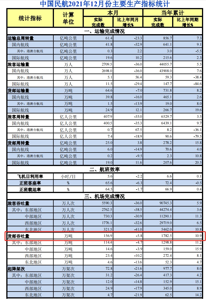 智通财经APP获悉,2月21日,民航局发布的中国民航2021年12月份主要生产指标统计显示,2021年12月机场货邮吞吐量为156.9万吨,同比减少5.8%。2021年全年机场货邮吞吐量为1782.5万吨,同比增长10.9%。