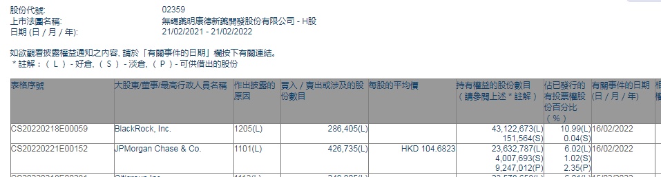 智通财经APP获悉,香港联交所最新资料显示,2月16日,小摩增持药明康德(02359)42.6735万股,每股作价104.6823港元,总金额约为4467.16万港元。增持后最新持股数目约为2363.28万股,最新持股比例为6.02%。