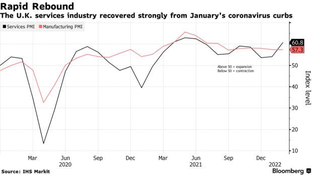 Bloomberg经济学家Dan Hanson表示:“2月份综合PMI的反弹表明,自今年年初以来,Omicron疫情带来的阻力已经减弱,这与我们认为经济在2月份恢复增长的观点一致。英国经济在未来的重大挑战是,在通胀飙升的情况下,人们的生活水平正迅速受到打击。”