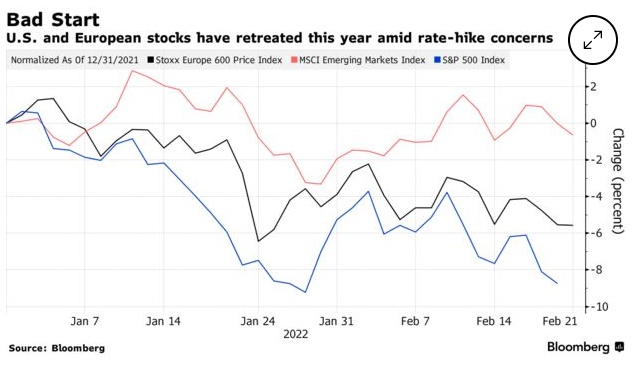 据悉,马特伊卡发表此乐观观点,正值周一欧洲股市震荡之际,投资者正权衡乌克兰的地缘政治事态发展。而在此之前,全球股市今年普遍开局不佳,其背后的主要原因是通胀上升,且有迹象显示各央行将采取强硬措施。据了解,泛欧斯托克600指数今年以来下跌了约5.8%,而标准普尔500指数下跌了约8.8%。