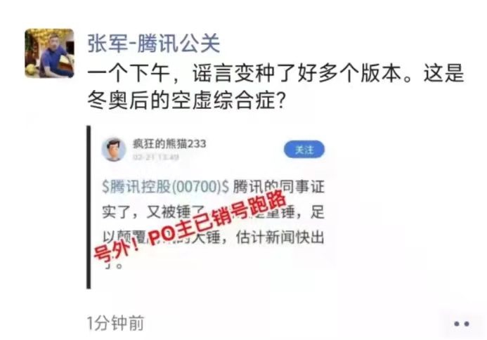 今日也有另外一则传言在市场上引起轩然大波,某平台一位用户发布消息称“腾讯将被重锤”。此消息在业内迅速发酵,引起了市场的恐慌情绪。随后,腾讯集团公关部总经理张军发布微信朋友圈澄清,其为“谣言”。张军在朋友圈中表示:“一下午,谣言变种了好多版本”。截至发稿前,发布该消息的用户已清空发言并主动销户,在平台上已无法搜索到。