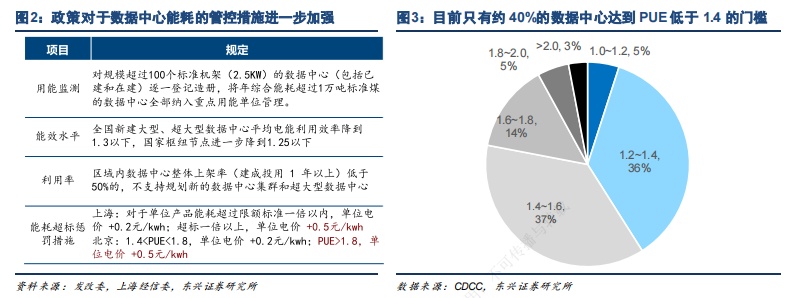 与此同时,《通知》亦明确“东数”节点PUE在1.25以下,“西算”节点PUE在1.2以下,并鼓励数据中心节能减碳、可再生能源供电,数据中心绿色化趋势更为凸显。