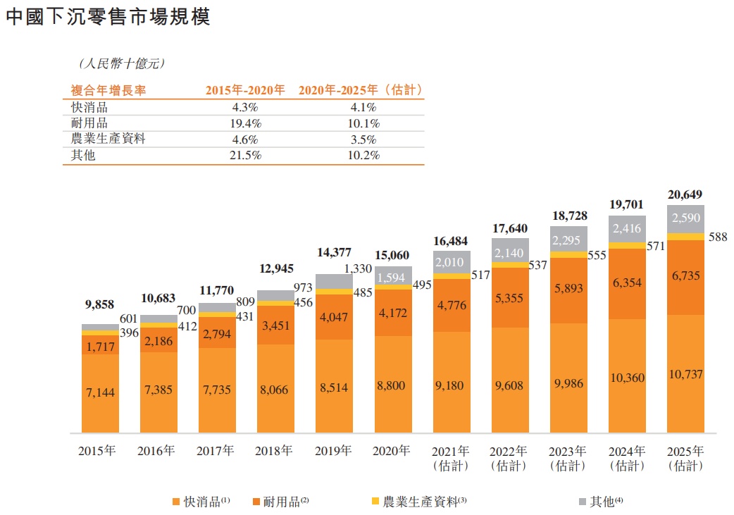 其中的下沉市场规模从2015年的9.9万亿元上升至2020年15.1万亿元,复合年增长率达到8.8%;预计2025年有望达到20.6万亿元的市场规模,2020年至2025年的复合年增长率为6.5%,超过零售市场整体的增长速度。
