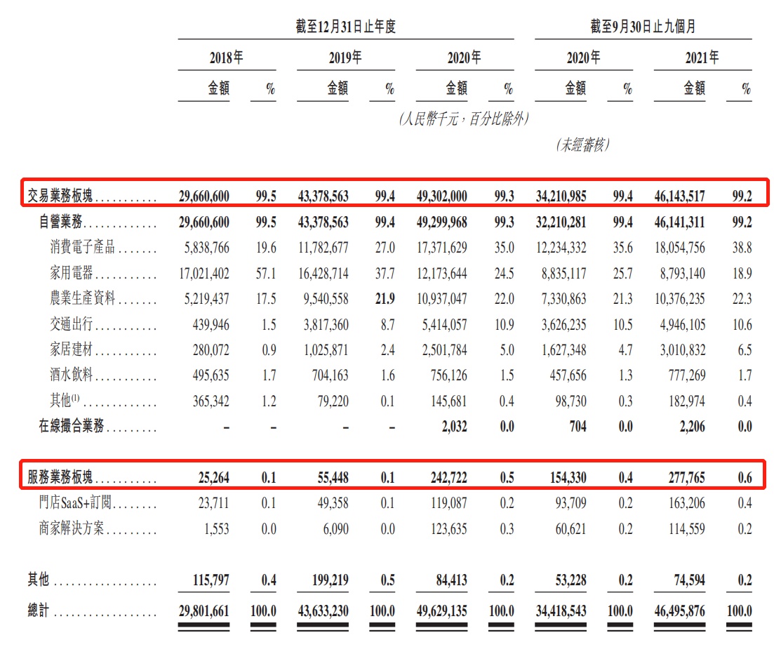 在飞轮效应的加持下,汇通达业绩增长迅速;截至2021年9月30日止九个月,公司的交易业务营收达到461.4亿元,同比增长35%,毛利率为2.2%;服务业务营收达到2.8亿元,同比增长80%,毛利率达到59.6%。