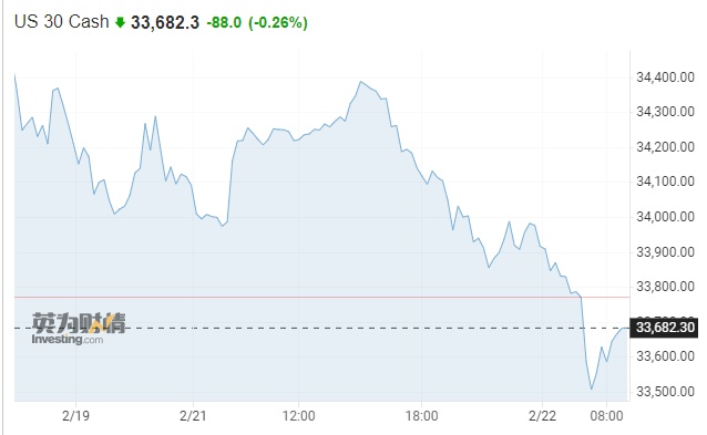 此前,普京宣布承认乌克兰东部的“顿涅茨克人民共和国”和“卢甘斯克人民共和国”,受此影响,道指期货一度下挫逾400点。截至发稿,道指期货跌0.26%,标普500指数期货跌0.17%,纳指期货跌0.14%。
