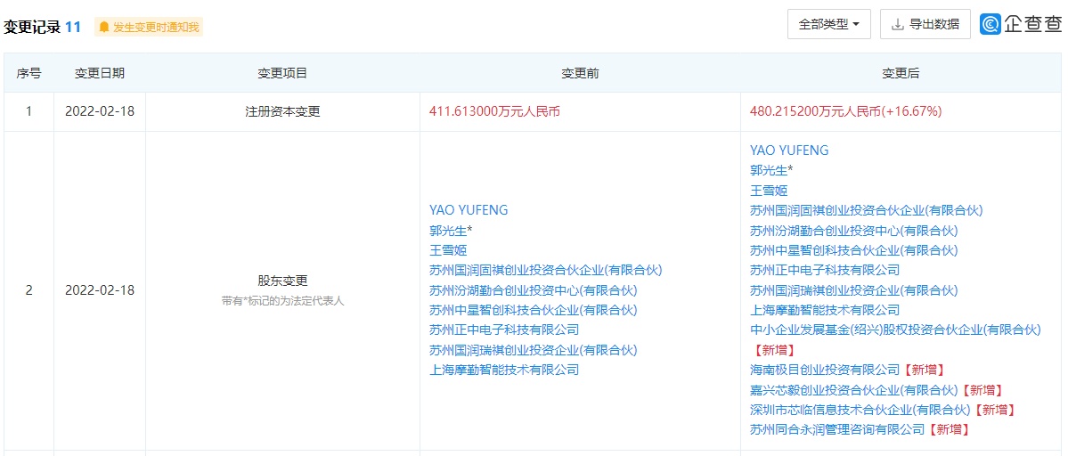 智通财经APP获悉,企查查APP显示,2月18日,莱弗利科技(苏州)有限公司发生工商变更,新增小米关联公司海南极目创业投资有限公司为股东,同时公司注册资本由411.613万元人民币增加至480.215万元人民币,增幅16.67%。