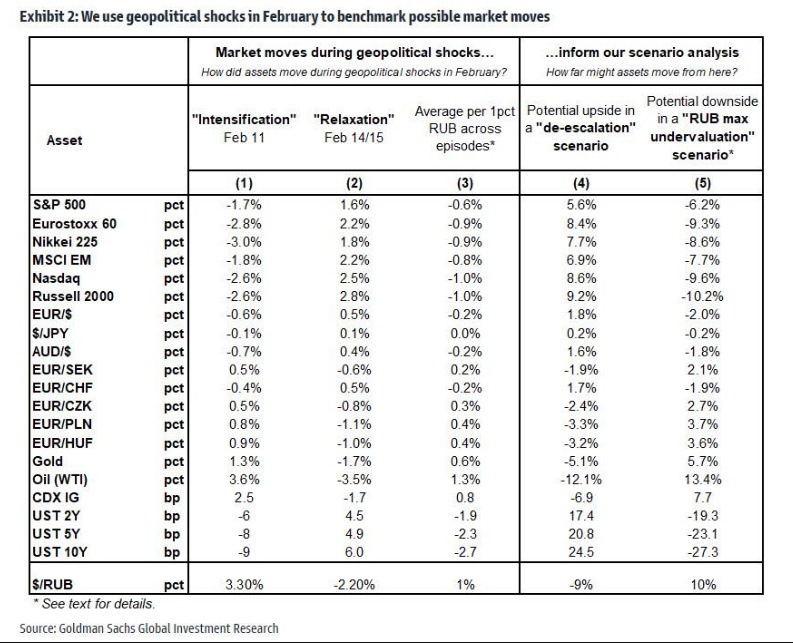 由于地缘政治动荡是众所周知最难把握的交投因素,高盛策略师正根据近期全球资产对卢布的敏感性进行计算。该行策略师称,最糟糕的情境是,俄罗斯卢布下跌10%将推动油价上涨13%,并导致基准美国国债收益率下降27个基点。