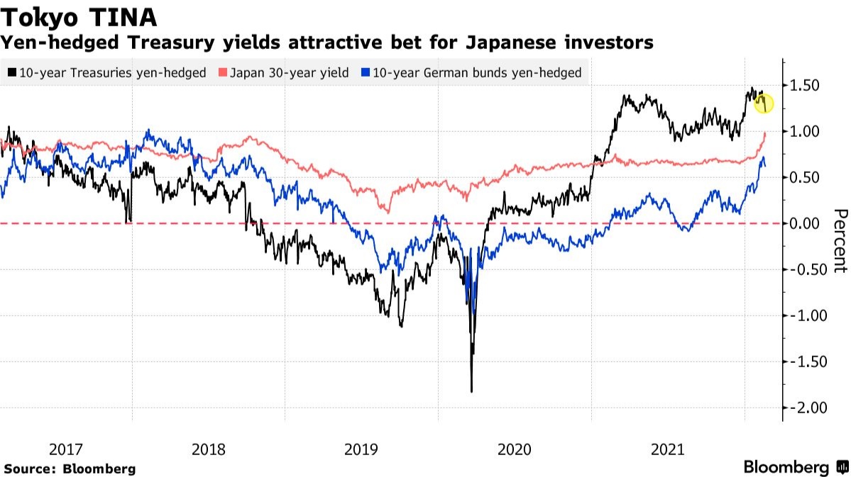 数据显示,截至上周五,对日元进行对冲的美国10年期国债收益率(10-year Treasuries yen-hedged)为1.21%,相比之下,德国国债的等值头寸为0.61%,日本30年期国债为0.94%。