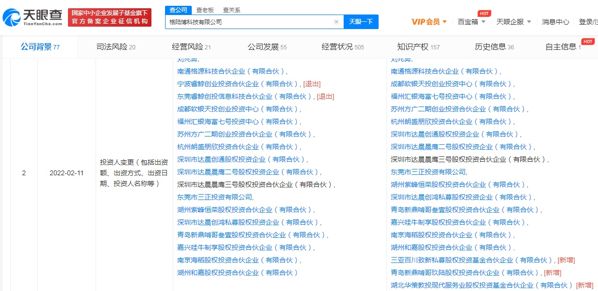 智通财经APP获悉,天眼查App显示,格陆博科技有限公司(下称:格陆博)发生工商变更,股东新增百度关联企业三亚百川致新私募股权投资基金合伙企业(有限合伙)、湖北华策教投现代服务业股权投资基金合伙企业(有限合伙)等。