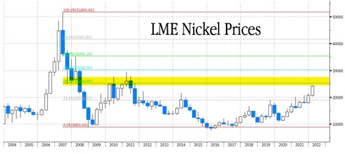 智通财经APP了解到,截至发稿,LME期镍价格涨1.75%,至每吨24775美元,为2011年8月以来的最高水平。 到目前为止,2022年的LME期镍价格已经上涨了18%。