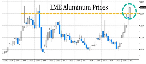 俄罗斯是金属的主要生产国,铝价也不断飙升。投资者担心,如果俄乌发生军事行动,供应链中断或制裁可能会打击该国的出口。而铝价却正处于突破新高的边缘。