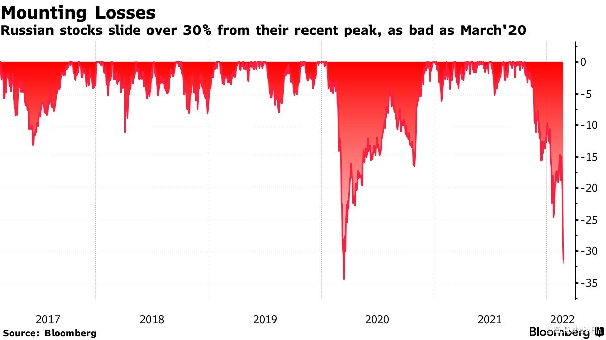 周二,普京下令军队进驻乌克兰东部争议地区后,俄罗斯股市继续下跌。基准的MOEX指数已从去年10月的高点下跌逾30%,其中大部分跌幅都是在本周发生的。