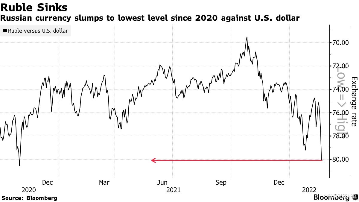卢布曾跌至2020年末以来的最低水平,随后在当地时间周二下午收复跌幅并上涨 0.3%。在与乌克兰的紧张局势不断加剧之际,卢布仍是2022年表现最差的货币之一。