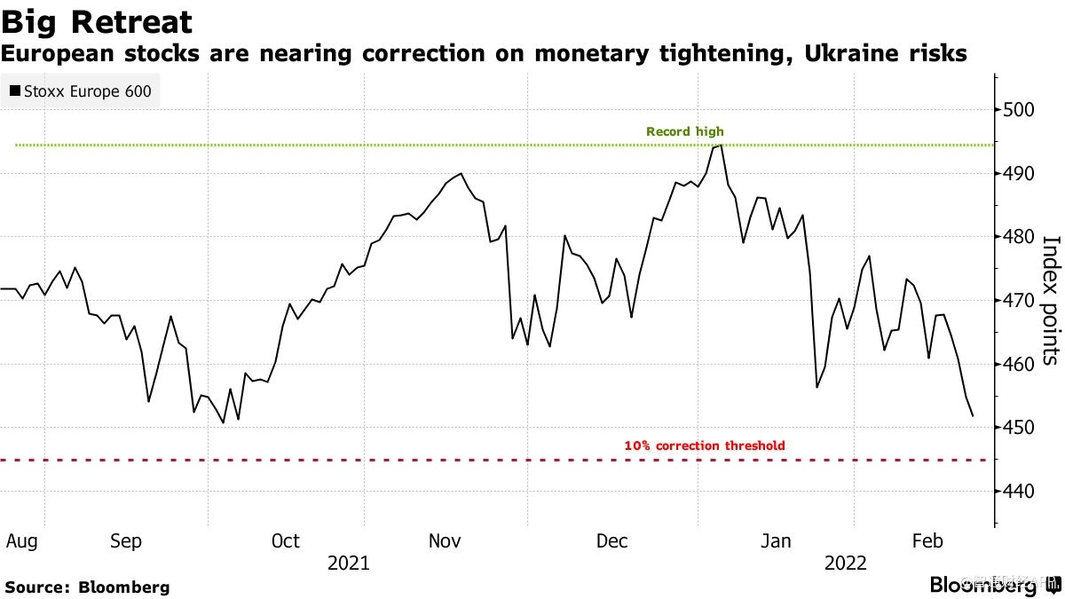 乌克兰危机加剧了投资者对全球股市的担忧。此前,由于投资者担心各大央行为遏制不断飙升的通胀而采取激进的货币紧缩措施,全球股市暴跌。宏观经济形势不容乐观,拖累主要股指从历史高点回落,斯托克欧洲600指数回调近10%。