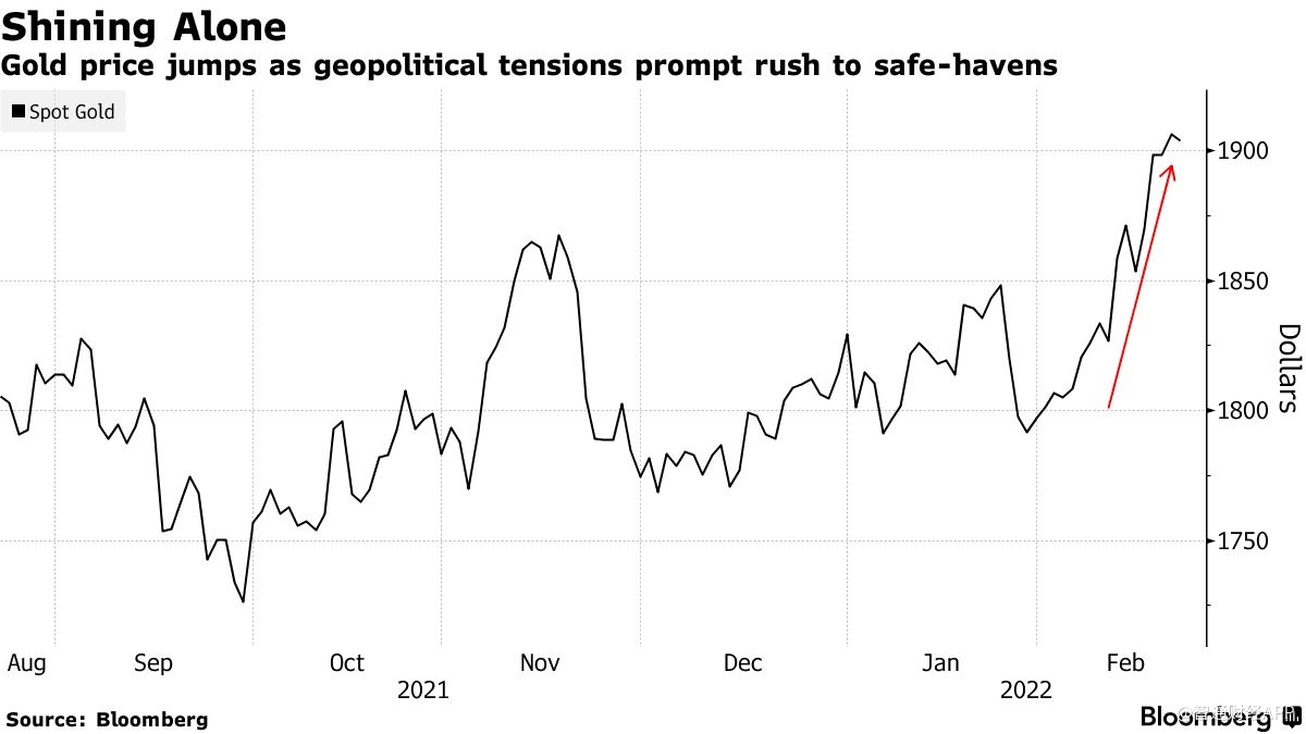 随着投资者寻求更安全的投资,现货黄金价格在2月份大幅上涨。金价触及2021年6月以来的最高水平。