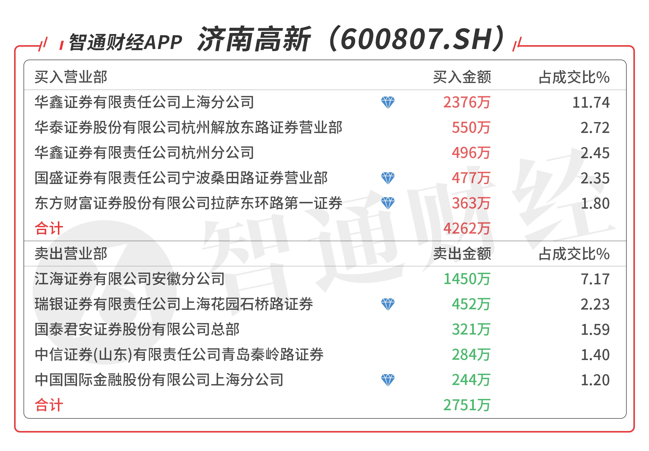 济南高新(600807.SH):多主力现身龙虎榜,机构与游资产生分歧,机构卖出452万元,买一是知名游资的席位买入2376万元,买四是知名游资的席位买入477万元,当日净买入1511万元,该股今日突破所有均线强势涨停,预计有溢价。
