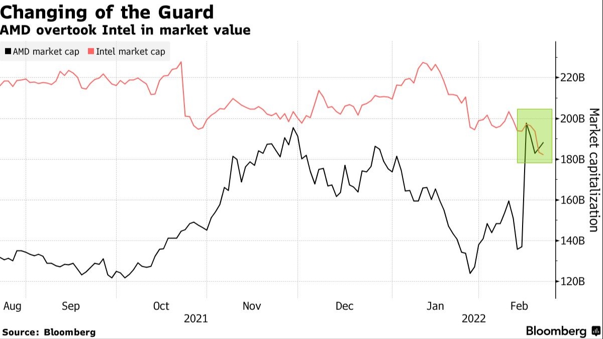 智通财经APP获悉,得益于强劲的季度报告和预期,以及完成对赛灵思(XLNX.US)的收购,AMD(AMD.US)近几周一直在上涨,该股目前的市值已经从今年早些时候的不足1,250亿美元飙升至突破1880亿美元。相比之下,英特尔(INTC.US)周二收跌近0.8%,目前市值为约1,820亿美元。据悉,AMD上周二收盘时,该股市值首超英特尔。
