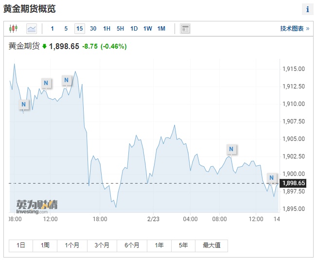 周二,金价曾触及每盎司1914.25美元,为2021年6月以来的最高水平;目前在每盎司1900美元上下波动,截至发稿,黄金期货价格跌0.46%,报每盎司1898.65美元。