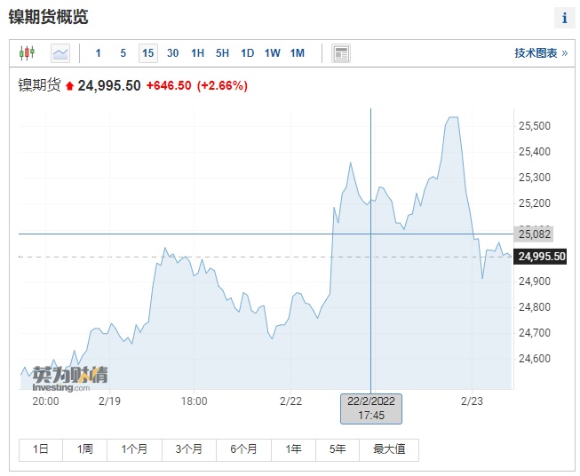 镍价周二持稳,收涨0.86%,此前自2011年以来首次突破每吨2.5万美元。截至发稿,LME期镍涨2.66%,报每吨24995.50美元。