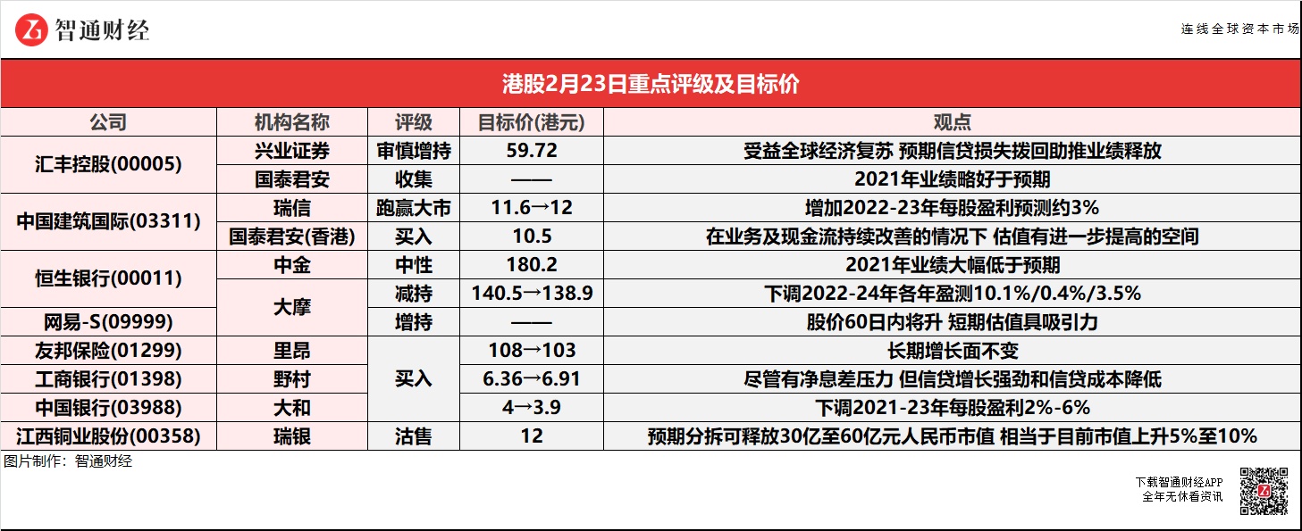 兴业证券上调汇丰控股(00005)评级至“审慎增持”,目标价提高14.3%至59.72港元,目标价对应2022-24年0.77倍/0.75倍/0.74倍PB,建议投资者关注。随着全球推行疫苗接种计划及全球经济的稳健复苏,未来公司经营前景或较2021年更为乐观。公司预期在2023年内完成出售美国大众市场零售银行业务,未来将在美洲及欧洲大陆市场聚焦批发及财富管理客户的国际化需求。亚洲地区将继续加强财富管理业务,推出汇丰大湾区理财通服务。