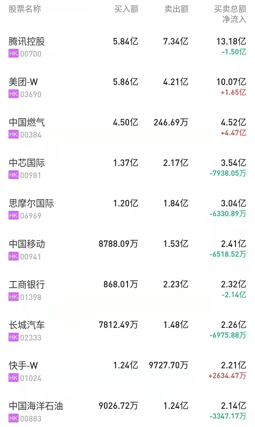 北水净买入最多的个股是美团-W(03690)、中国燃气(00384)、快手-W(01024)。北水净卖出最多的个股是中国移动(00941)、腾讯(00700)、工商银行(01398)。