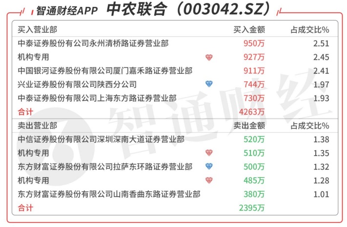 中农联合(003042.SZ):多主力现身龙虎榜,机构对倒净买入640万元,买四是知名游资方新侠的席位买入742万元,当日净买入3072万元,该股今日高开快速涨停,预计压力位在20日线附近。