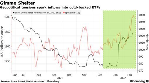 不断上升的全球风险并没有影响到那些涌入以黄金为支撑的交易所交易基金的投资者。截至2月18日,Gold Shares的持有量较去年12月的20个月低点增加了50多吨。