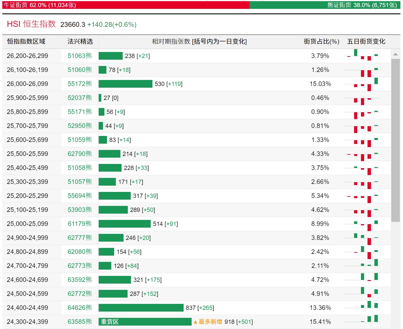 法兴恒指牛熊证街货分布图中的数据显示,熊证街货重货区和最多新增都在24300-24399区间,该区间最新熊证数量为918张,较上一交易日增加501张。