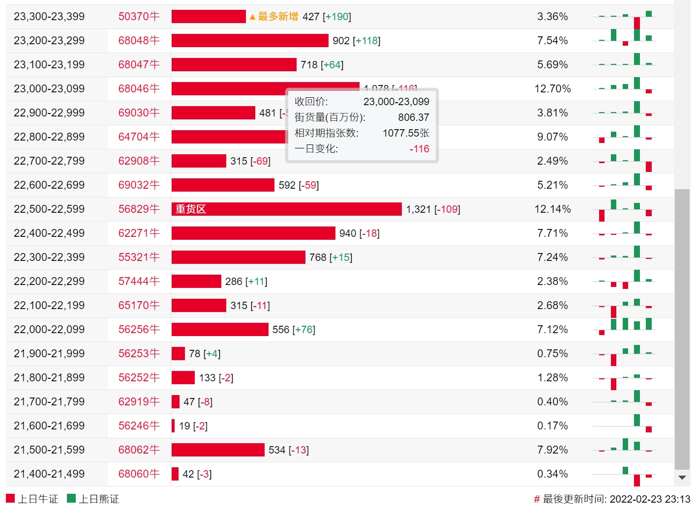 牛证街货重货区在22500-22599区间,该区间最新牛证数量为1321张,较上一交易日减少109张;最多新增在23300-23399区间,该区间最新牛证数量为427张,较上一交易日增加190张。